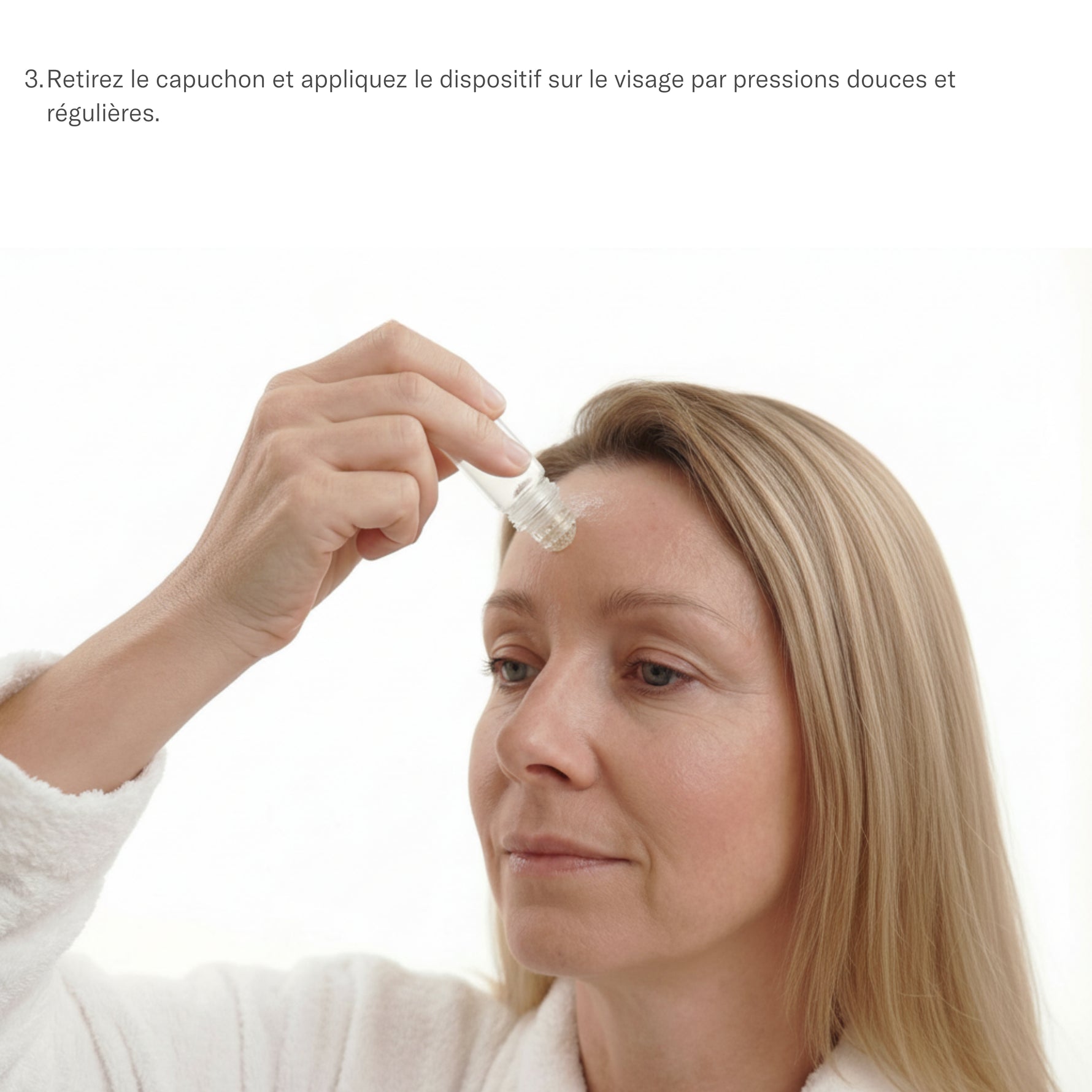 nettoyage de la peau, installation de la tête de micro-aiguilles, application du sérum par pressions légères et régulières, puis soin hydratant après la séance.